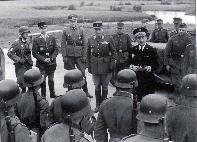 На фото: Генеральный уполномоченный французского правительства Виши Фернан де Бринон в окружении французских и немецких офицеров во время инспекции французского добровольческого легиона на Восточном фронте. Из открытых источников
