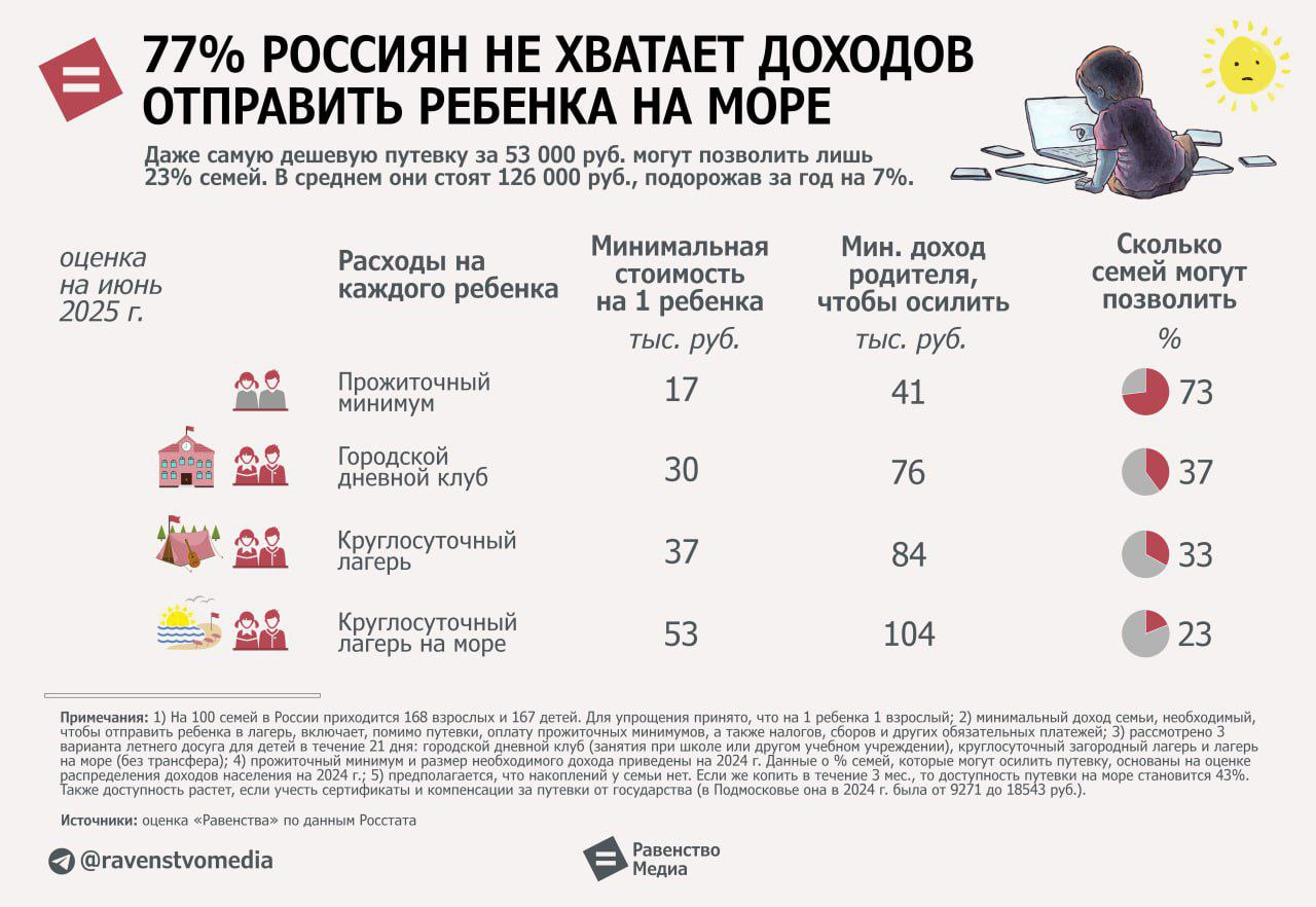 У многих ли есть свободные деньги? Согласно переписи, на 1 взрослого был 1 ребенок. Если не копить и не залезать в долги, то за вычетом налогов и прожиточного минимума для отправки ребенка в лагерь на море родитель должен получать не менее 103 600 руб. в месяц. Такая зарплата в 2024 г. была едва у 23% россиян.