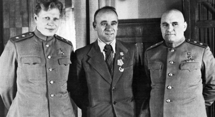 На фото: Сталинские наркомы – нарком вооружения СССР Д.Ф. Устинов, нарком танковой промышленности В.А. Малышев и нарком боеприпасов Б.Л. Ванников. Фото 11 августа 1944 года. Росатом
