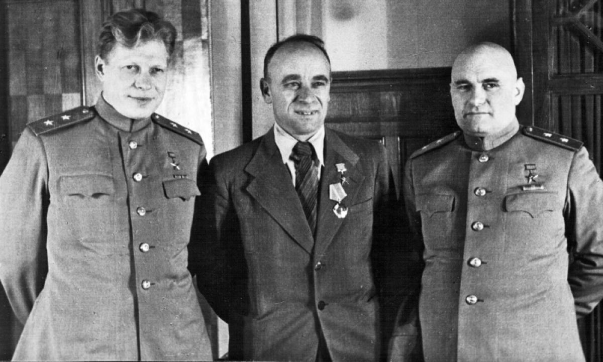 На фото: Сталинские наркомы – нарком вооружения СССР Д.Ф. Устинов, нарком танковой промышленности В.А. Малышев и нарком боеприпасов Б.Л. Ванников. Фото 11 августа 1944 года. Росатом