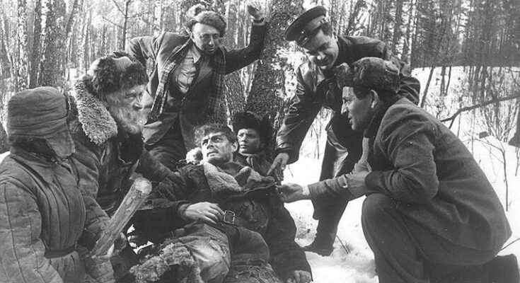 На фото: Павел Кадочников (лежит в центре) и Алексей Маресьев (второй справа) на съемках фильма «Повесть о настоящем человеке». Премьера фильма состоялась 22 октября 1948 года. Из открытых источников