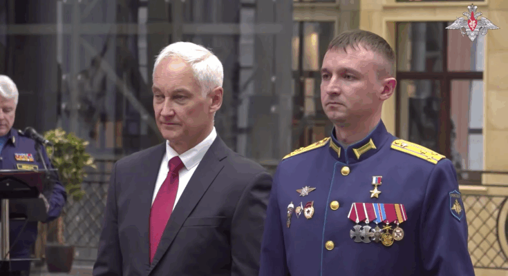 На фото: В преддверии Дня Воздушно-десантных войск министр обороны Российской Федерации Андрей Белоусов вручил медаль «Золотая Звезда» участнику специальной военной операции, Герою России, полковнику ВДВ Андрею Стрижаку. Фото с t.me / mod_russia
