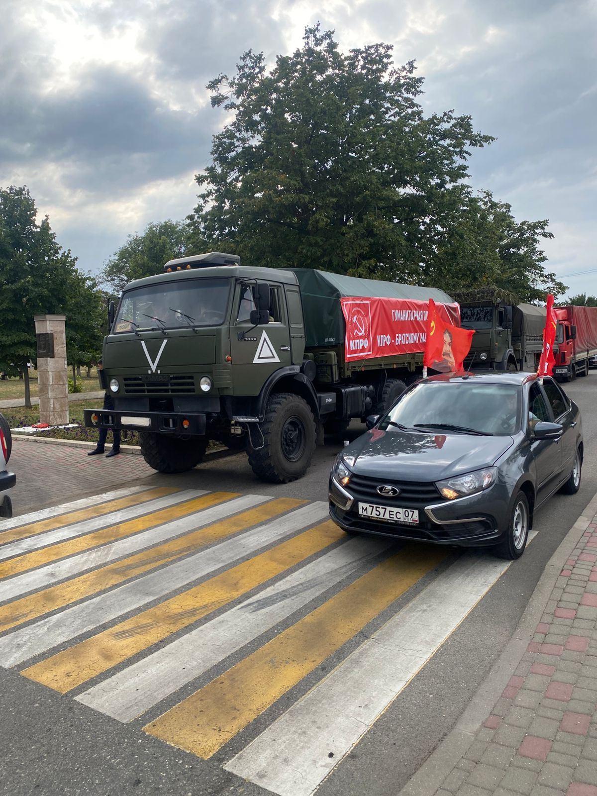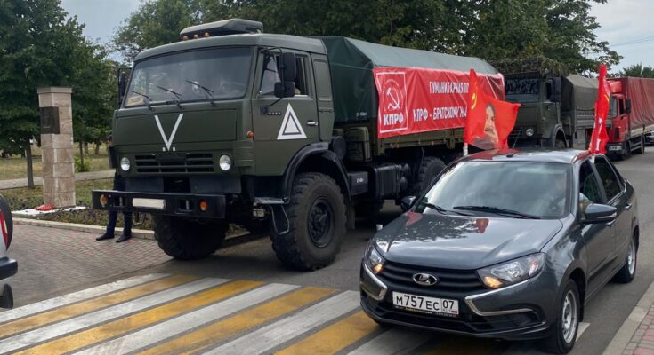Завершение автопробега ознаменовалось торжественным развертыванием увеличенной копии Знамени Победы и отправкой 141-го гуманитарного конвоя КПРФ для участников СВО, собранного совместными силами коммунистов со всего Северного Кавказа.