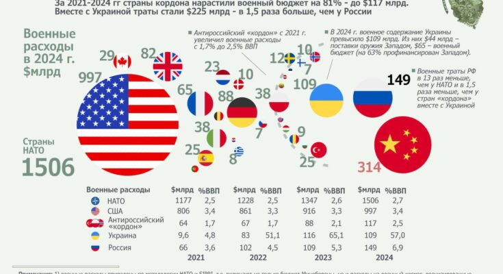 С учетом Украины военные траты антироссийского кордона достигают $225 млрд. Это в 1,5 раза больше, чем у России, расходы которой в 2024 г. SIPRI оценил в $149 млрд.