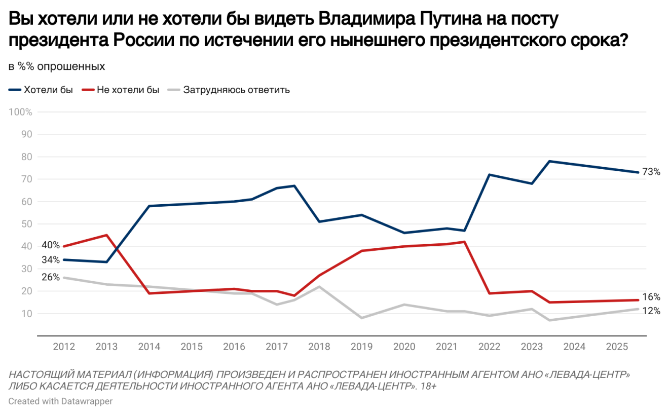 Три четверти опрошенных хотели бы видеть Владимира Путина на посту после окончания его президентского срока. Эта доля заметно выросла за последние три года на фоне конфликта с Западом.