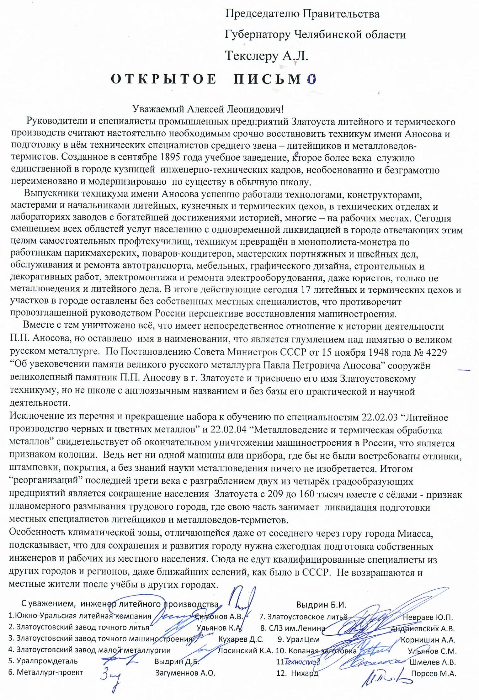 По этому поводу опубликовано открытое письмо руководителей организованных литейных цехов в городе Златоусте Председателю Правительства – Губернатору Челябинской области А.Л. Текслеру, которое до него его службой не доведено.