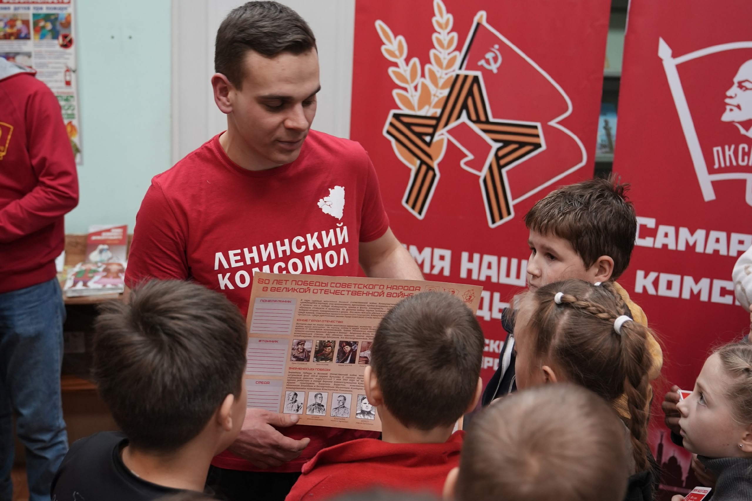 В конце занятия каждый школьник получил в подарок копию Знамени Победы – главного символа триумфа советского народа. А практичным и содержательным сувениром стали листы для расписания уроков, на которых размещена информация о юных героях Великой Отечественной войны.
