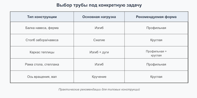 Теперь вы знаете главный секрет выбора между круглой и профильной трубой: думайте не о форме сечения, а о типе нагрузки, которая будет действовать на конструкцию.