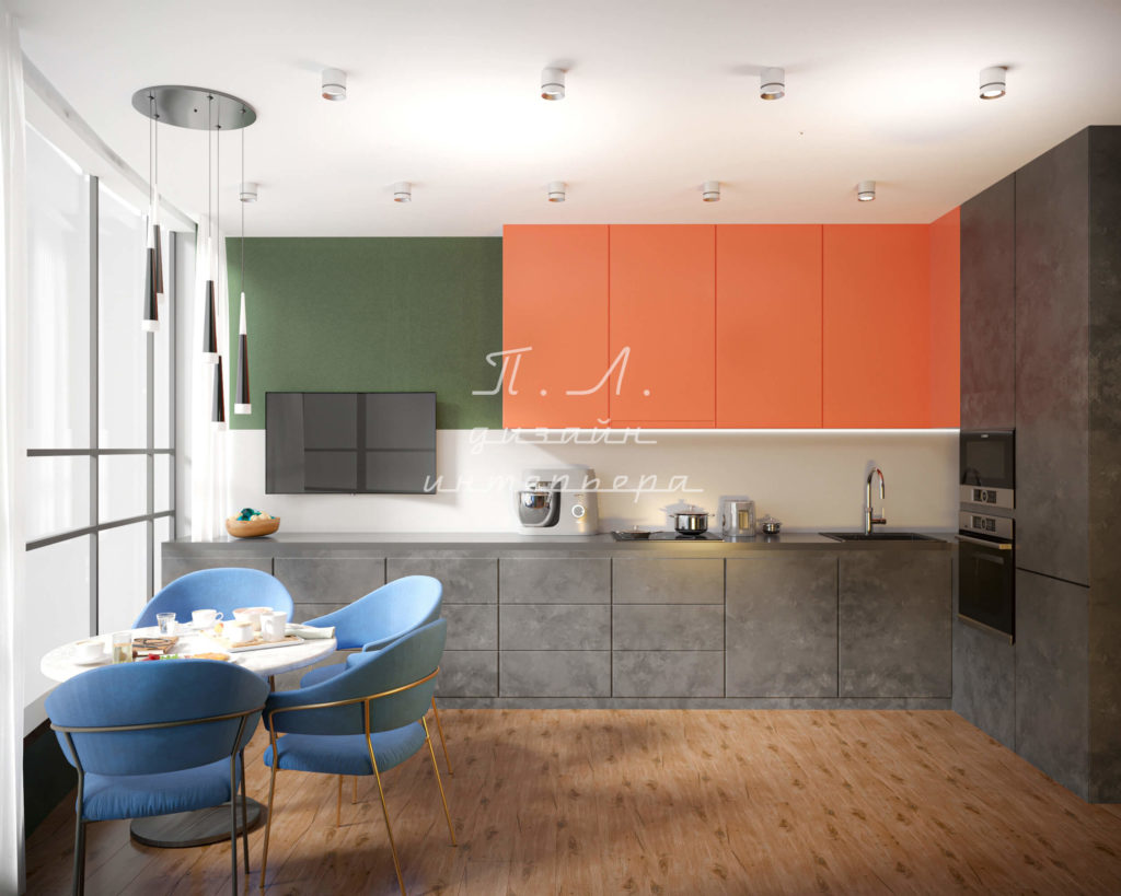 Цвет кухни привязан к общему интерьеру помещения и стилю квартиры. Если у вас белая квартира, впишется белая кухня. Если квартира в серых тонах, рассмотрите к нему подойдет кухня оттенка антрацит или графит. Чтобы не ошибиться с выбором, сделайте фотореалистичную визуализацию кухни и смежной гостиной.